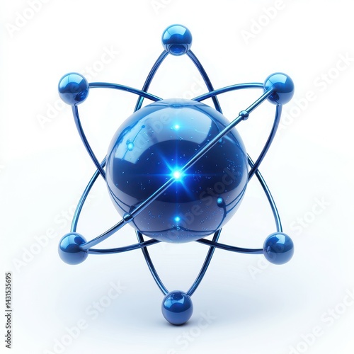 Blue atomic model with glowing nucleus and orbiting electrons in a digital style