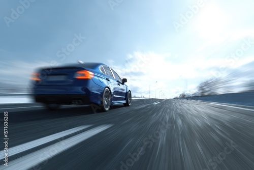 Blue car speeds down the highway with blurred surroundings, capturing the essence of high-speed travel in an open environment
