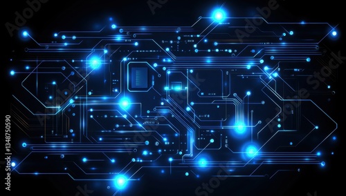 Blue circuit board background with glowing lights, representing digital technology and cybersecurity concepts