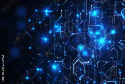 Blue circuit board with glowing lines and polygonal shapes for tech, science, and futuristic designs