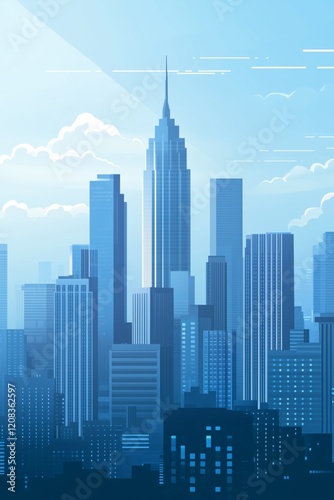 Blue city skyline with iconic skyscraper and cloudy sky