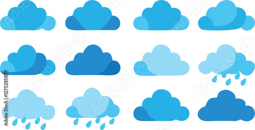 Blue Cloud Icon Set with Rain and Weather Symbols on Transparent Background