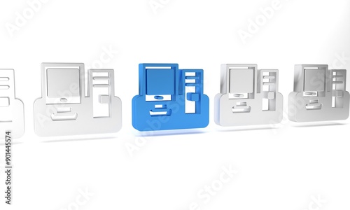 Blue Computer monitor with keyboard and mouse icon isolated on white background. PC component sign. Minimalism concept. 3D render illustration