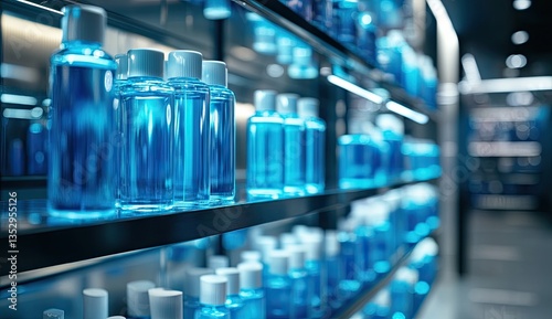 Blue cosmetic bottles on store shelves. Retail display of liquid products