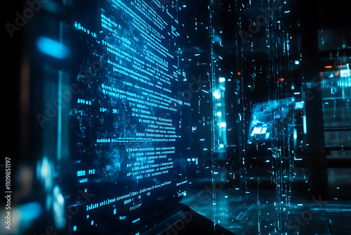 Blue digital binary data on a computer screen, creating a futuristic, high-tech atmosphere with flowing numbers and abstract patterns
