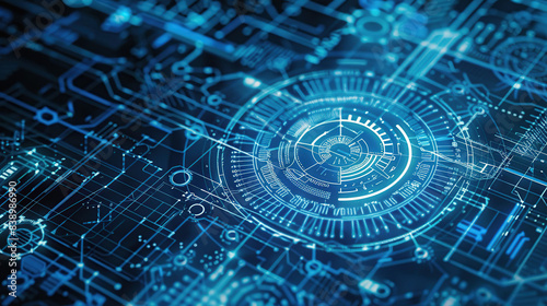 Blue digital technology background with mechanical elements and circuit board