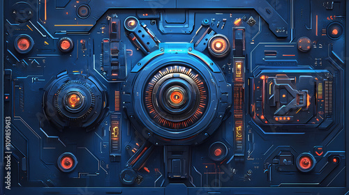 Blue digital technology background with mechanical elements and circuit board. Mechanical. Illustration