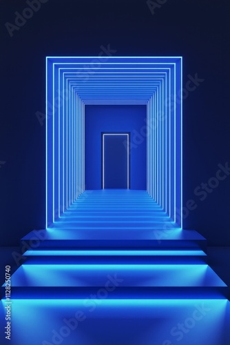 Blue empty room background, symmetrical lines of light on the ground leading to an open door at the end of the line