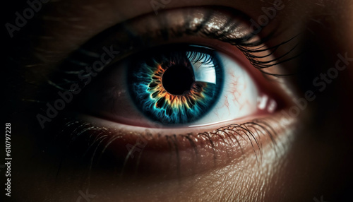 Blue eyed woman staring at camera with macro view of iris generated by AI