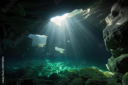 Blue fantasy cave, Beautiful landscape with river, sky and trees fantasy background generated AI