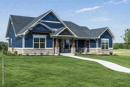 Blue farmhouse, curb appeal, rural setting, sunny day, real estate