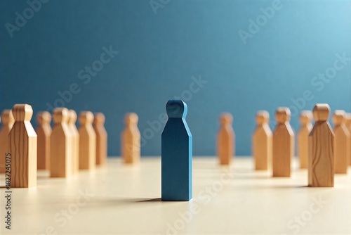 Blue figure stands alone among wooden pawns, symbolizing leadership or individuality in a crowd. Minimalist composition.