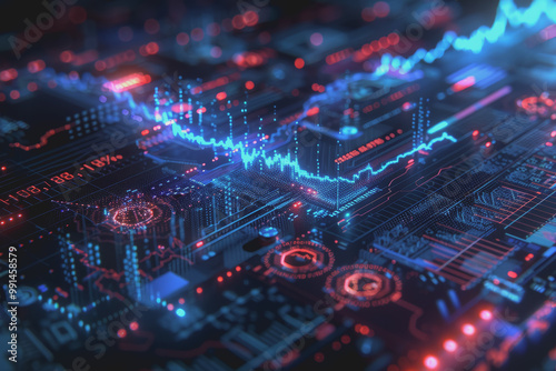 Blue financial graphs and charts with coins show business growth and investment market profits.