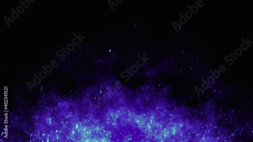 Blue Fire embers particles over black background. Fire sparks background. Abstract dark glitter fire particles lights.