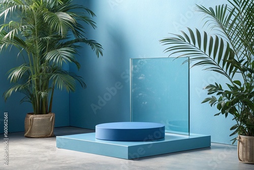 Blue frosted glass panel and blue podium on blue background. Minimal background for branding and product presentation.