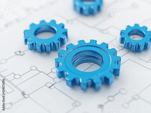 Blue gears on technical blueprint symbolize engineering and mechanical design concepts