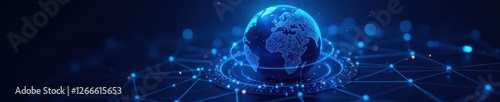 Blue globe encircled by glowing network lines, digital world concept, research, data, system