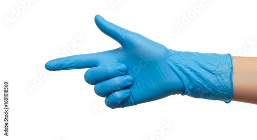 Blue Gloved Hand Making a Finger Gun Gesture, Pointing Left on a Clean White Background.