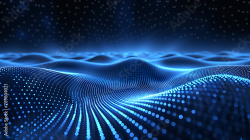 blue glow in dark background with light with waves, in the style of line and dot work, digital as manual, intel core, light bronze and dark blue, dotted, rollerwave, three-dimensional space