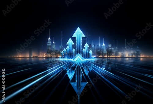 Blue glowing arrows rising from a city skyline reflected in a dark surface.