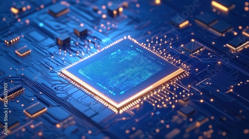 Blue glowing chip on a circuit board; tech, data and engineering use