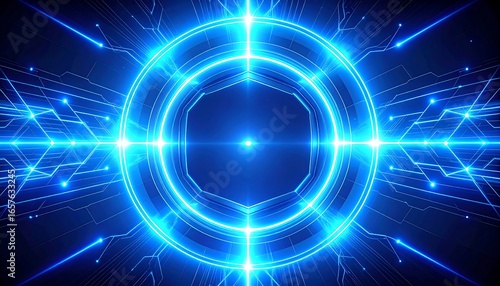 Blue glowing circle, circuit lines, dark background