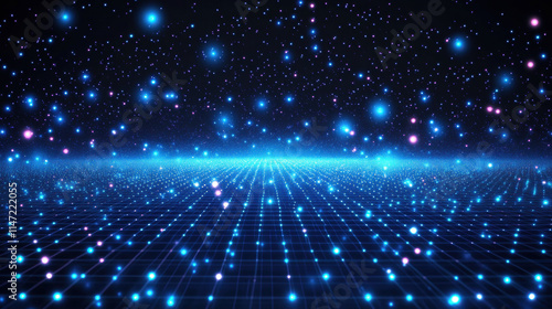 Blue glowing digital grid background with stars and light particles, a futuristic technology concept