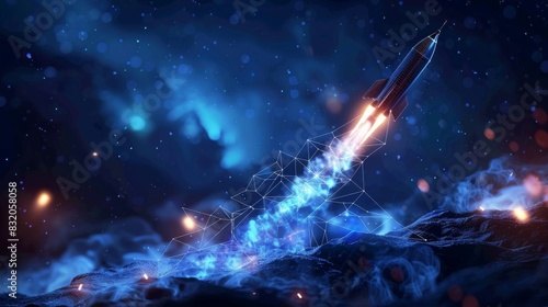 Blue glowing light bulb rocket launch with a wireframe light connection structure. Low poly style design with an abstract geometric background. Isolated illustration. Modern 3D graphic concept.
