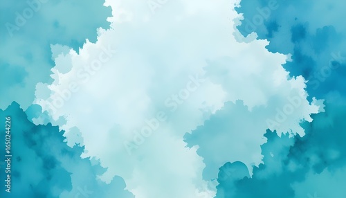 Blue Green Watercolor Background with White Cloudy Center and Abstract Sky Border Texture