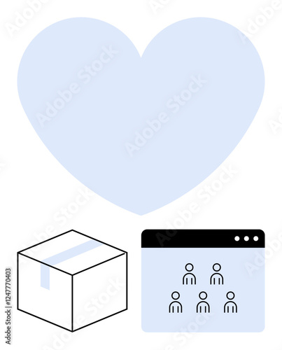 Blue heart symbol above a shipping box and a browser window with user avatars. Ideal for e-commerce, teamwork, community, logistics, online platforms, customer service, abstract line flat metaphor