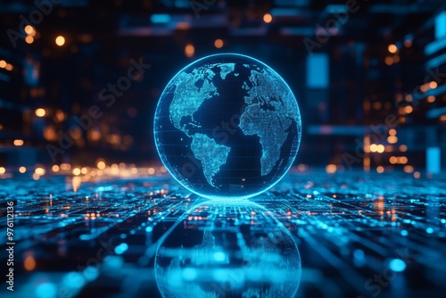 Blue holographic globe with world map and glowing data streams for ai global communication networks