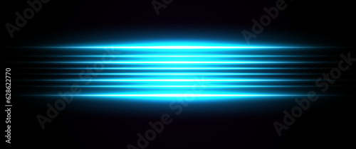 Blue horizontal lens flares pack. Laser beams, horizontal light rays. Beautiful light flares. Glowing streaks on dark background.