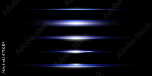 Blue horizontal lens flares pack. Laser beams, horizontal light rays.Beautiful light flares. Glowing streaks on dark background. Luminous abstract sparkling lined background.