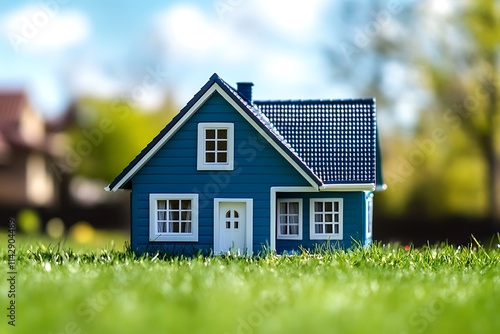 Blue House Model in a Green Grassy Field
