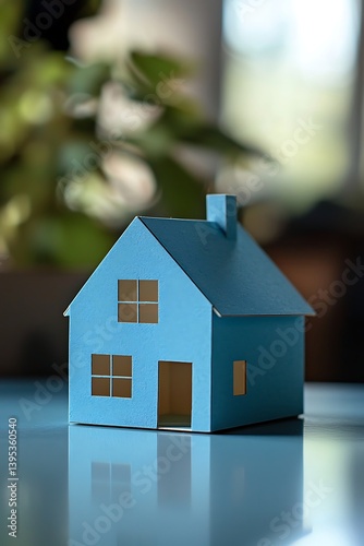 Blue house model on a smooth surface, symbolizing tranquility and peace in minimalist home design