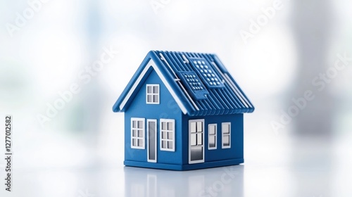 Blue House Model with Solar Panel for energy efficiency, showcased on display for marketing
