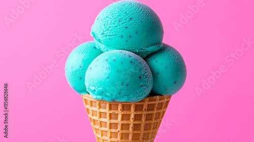 Blue ice cream cone with four blue ice cream scoops in it. The cone is in a pink background