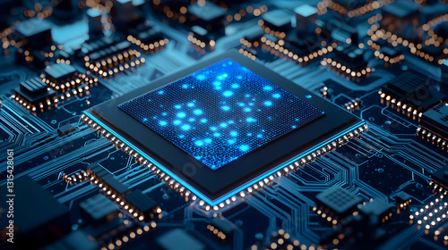 Blue Illuminated Microchip On Dark Circuit Board With Glowing Details And Futuristic Technology Design For Innovation And Power