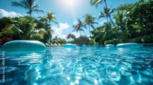 Blue Inflatable Tubes Floating On Sparkling Clear Pool Water Surrounded By Lush Tropical Palm Trees Under Bright Summer Sunlight