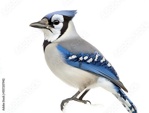 Blue jay perched serenely, detailed beak and feathers, against a pure white background.