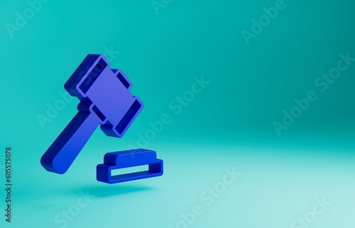 Blue Judge gavel icon isolated on blue background. Gavel for adjudication of sentences and bills, court, justice. Auction hammer. Minimalism concept. 3D render illustration