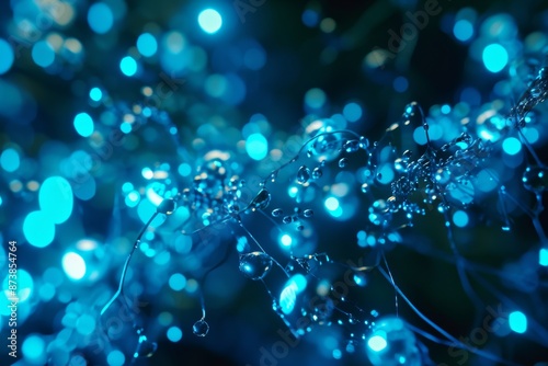 Blue light shines through bubbles in water, Futuristic backdrop of blue abstract molecular motion generated by AI