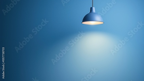 Blue lighted lamp is hanging from the ceiling. The light is shining on the wall, creating a bright and cheerful atmosphere
