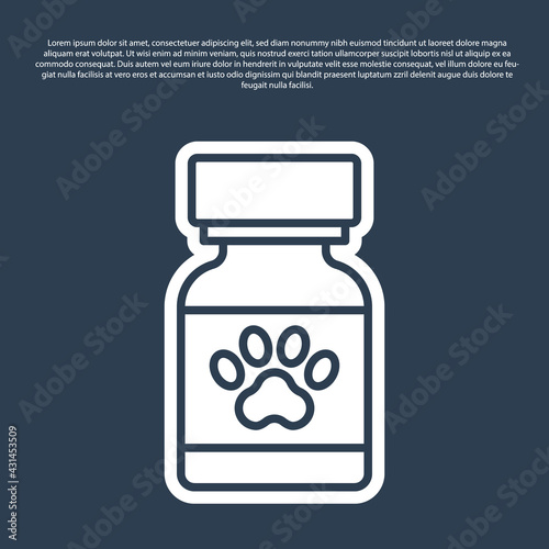 Blue line Medicine bottle and pills icon isolated on blue background. Container with pills. Prescription medicine for animal. Vector