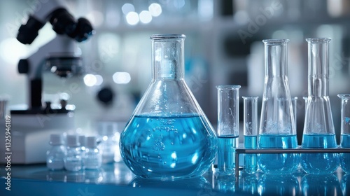 Blue Liquid in Erlenmeyer Flask and Test Tubes in a Laboratory Setting