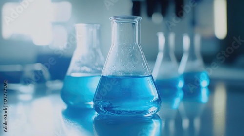 Blue Liquid in Erlenmeyer Flasks, A Close-up View of Scientific Experimentation