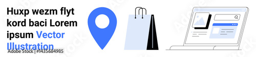 Blue location marker, shopping bag, and laptop screen displaying an online product. Ideal for ecommerce, delivery service, online store, digital marketing, shopping, shipping simple landing page