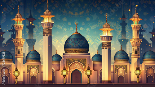 Blue Mosque Exterior with Pattern on Sky Illustration. Eid and Ramadan 2024.