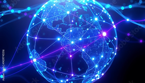 Blue Neon Globe Surrounded by Glowing Fiber Optics on a Black Background Displaying Global Connection and Technology Innovation Detailed 3D Render