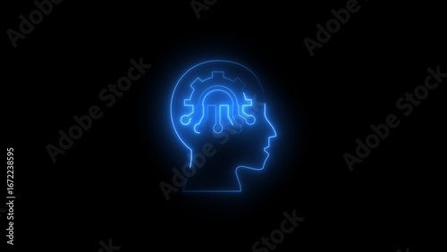 Blue Neon Human Head Icon With Gear and Circuitry on Black Background artificial intelligence brain
